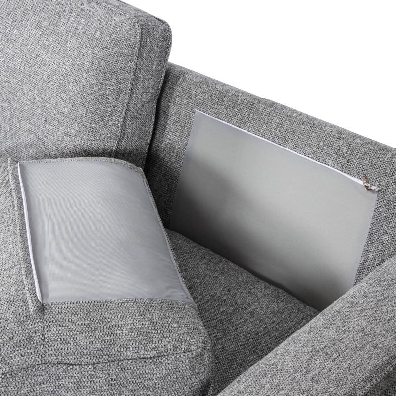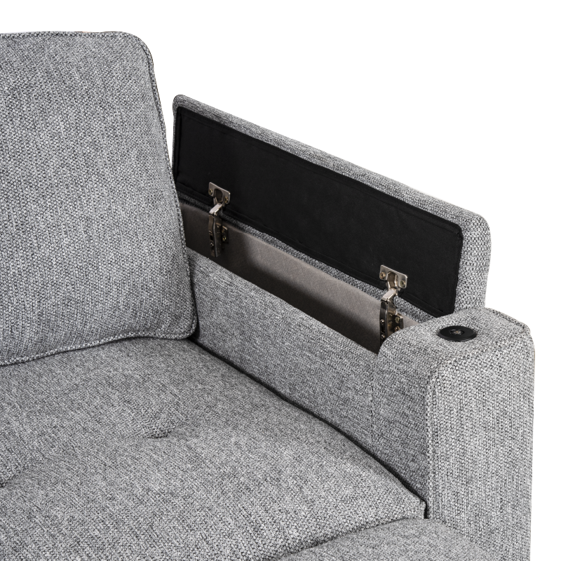 ● Sectional sofa armrests have a hidden storage and the lid stays open in the position so that you can take out and put back the things you are storing conveniently, which will save space and complement the existing interior design.
