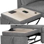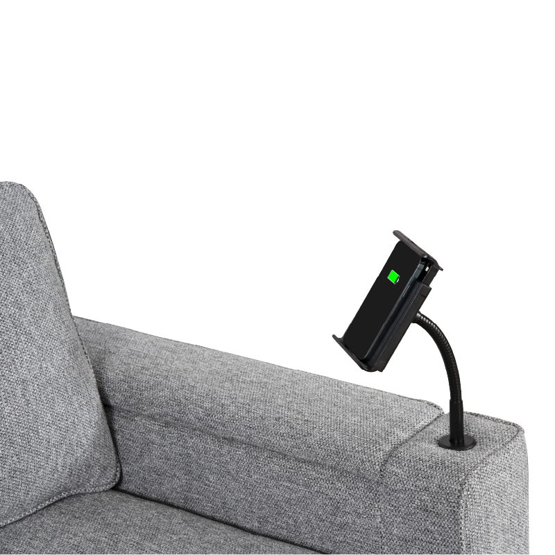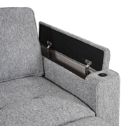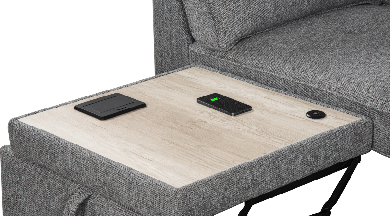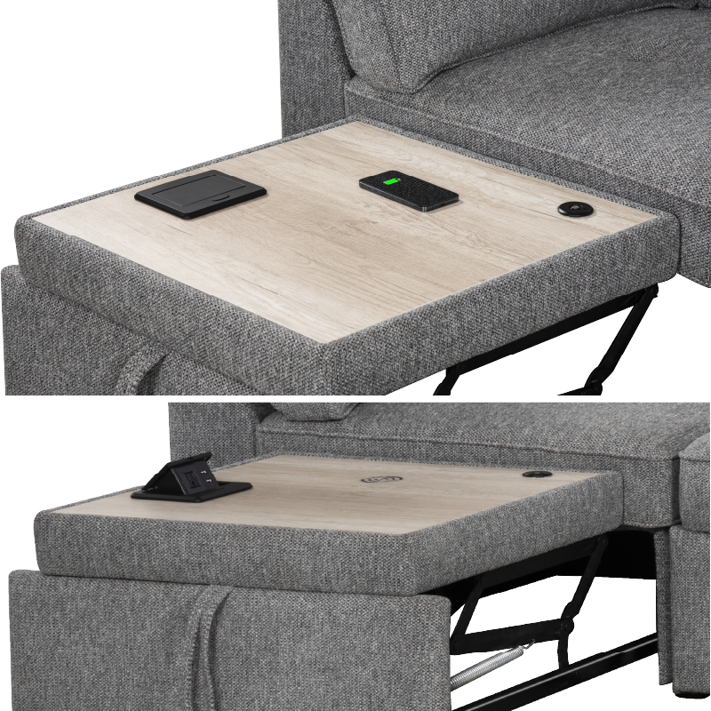 ● The sofa features a pull-out table platform that extends smoothly, offering a convenient surface for various needs. This integrated table is equipped with a power grommet for connecting electronic accessories, as well as a wireless charging area for effortless device charging, providing ultimate convenience and functionality.